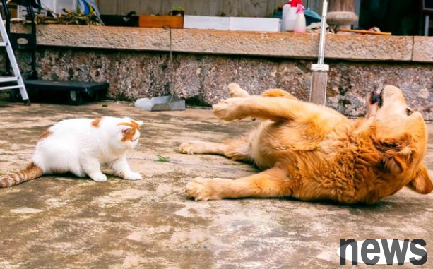 The cat had a good relationship with the golden retriever, but was very afraid of humans. The cat scavenger put some cat food in the yard, hoping that through his own efforts, he could slowly melt the little guy's heart.