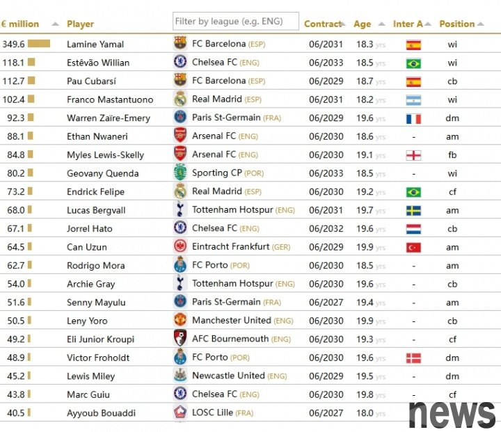 Today, CIES, the authoritative football statistics agency, counted the players who have not yet reached the age of 20 but have the highest estimated transfer fees. Four of them have estimated transfer fees of more than 100 million euros (including additional terms and 100% ownership). Yamal 350 million euros, leading the fault!
