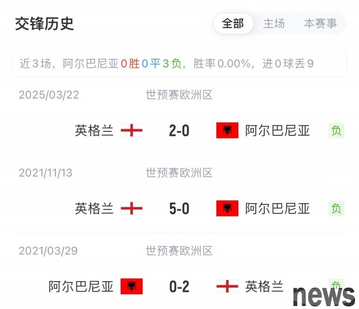 England has won all 7 rounds of the World Cup preliminaries with 21 points and has not conceded a goal so far, and has qualified for the World Cup two rounds ahead of schedule; Albania has 4 wins, 2 draws, and 1 loss in the World Cup preliminaries, ranking second in Group K with 14 points, and has been unbeaten in the past 6 rounds. England have won three games in a row against Albania.