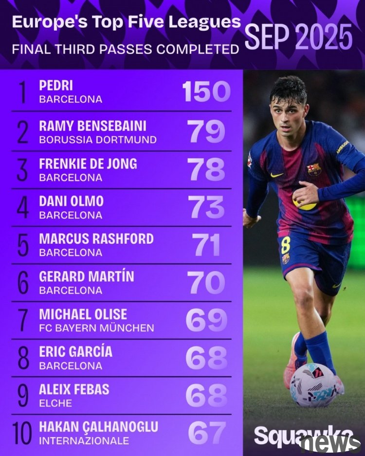 Barcelona won 5 wins and 1 draw in 6 games in September. Among them, Barcelona midfielder Pedri made an indelible contribution, and he was known as a combination of Xavi and Iniesta. According to Squawka data statistics, in the list of successful passes in the offensive third zone of the five major European leagues in September, Pedri led by 150 times.