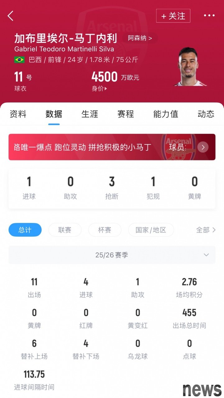 In this round of the Champions League, Arsenal defeated Atletico Madrid 4-0 at home. Martinelli, who started the game, scored the team's second goal with a wonderful push. He has already scored three goals in the three rounds of the Champions League. This season, he has scored a total of 4 goals, second only to his teammate Jocles.