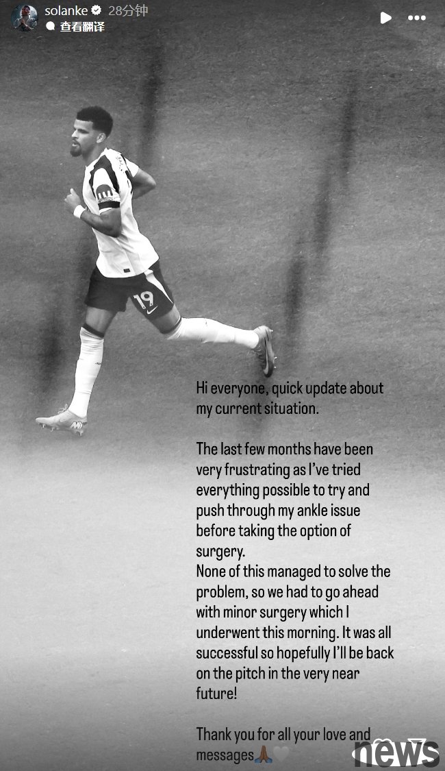 Tottenham coach Frank previously talked about Solank's injury: "We know Solank's ankle problem has been bothering him for a while, and he decided to have a minor surgery."