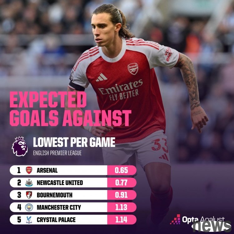 Opta counts the expected goals conceded by each team in the Premier League this season, and lists the ranking of the lowest expected goals conceded per game, with Arsenal ranking first with 0.65 goals.