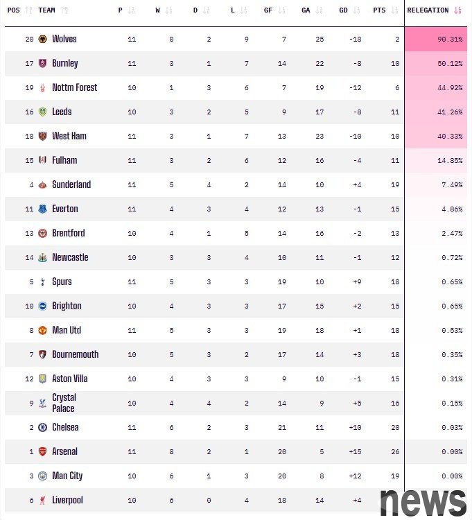 According to OPTA supercomputer predictions, Wolves' relegation probability has reached as high as 90.31%, and Burnley's relegation probability has exceeded 5 to 50.12%. Behind Burnley are Nottingham Forest (44.92%), Leeds United (41.26%), West Ham United (40.33%) and Fulham (14.85%). It is worth mentioning that as a newly promoted team, Sunderland performed amazingly. They currently rank fourth in the Premier League, with a relegation probability of only 7.49%.